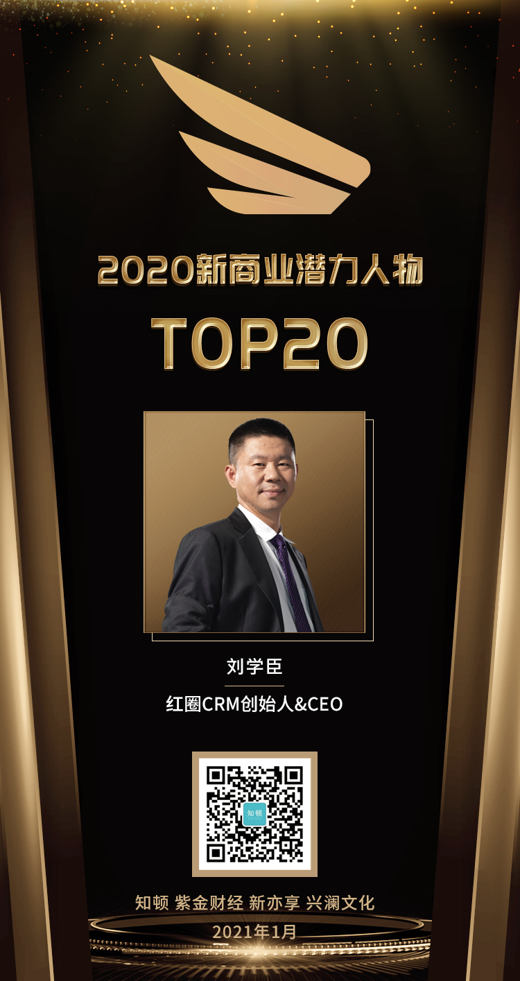 經過層層篩選,最終,紅圈CRM 創始人&CEO 劉學臣入選 “2020 新商業潛力榜人物TOP20”,紅圈 CRM 入選“ 2020 新商業潛力榜企業服務領域 TOP30”。