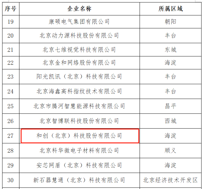 2021 年 10 月 29 日,北京市經(jīng)濟(jì)和信息化局將北京市 2021 年度第六批擬認(rèn)定“專精特新”中小企業(yè)名單予以公示,和創(chuàng)(北京)科技股份有限公司榮登榜單,此次公示期為 10 月 29 日至 11 月 4 日,目前已通過公示期。 根據(jù)北京市經(jīng)濟(jì)和信息化局的評審程序的有關(guān)規(guī)定,對于公示期無異議的,認(rèn)定為“北京市‘專精特新’中小企業(yè)”。