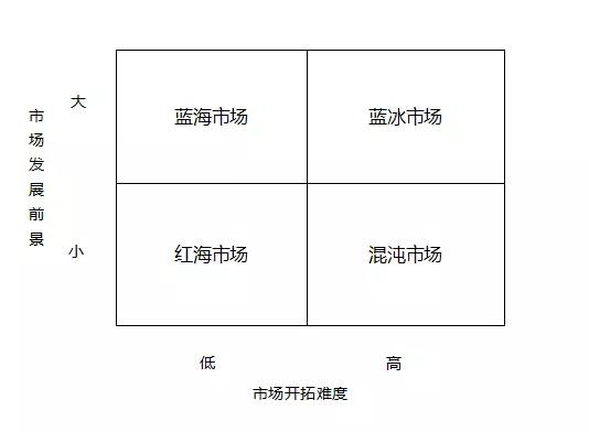 我們可以從市場(chǎng)開(kāi)拓難度和市場(chǎng)發(fā)展前景兩個(gè)維度分析不同類(lèi)型的市場(chǎng)?;煦缡袌?chǎng)的發(fā)展路徑不連續(xù),開(kāi)拓難度高,未來(lái)方向不確定,發(fā)展前景?。患t海市場(chǎng)已經(jīng)相當(dāng)成熟,開(kāi)拓難度最低,市場(chǎng)競(jìng)爭(zhēng)激烈,發(fā)展前景??;藍(lán)海市場(chǎng)相對(duì)藍(lán)冰市場(chǎng)而言,開(kāi)發(fā)難度較低,藍(lán)海市場(chǎng)和藍(lán)冰市場(chǎng)同樣市場(chǎng)前景較大。