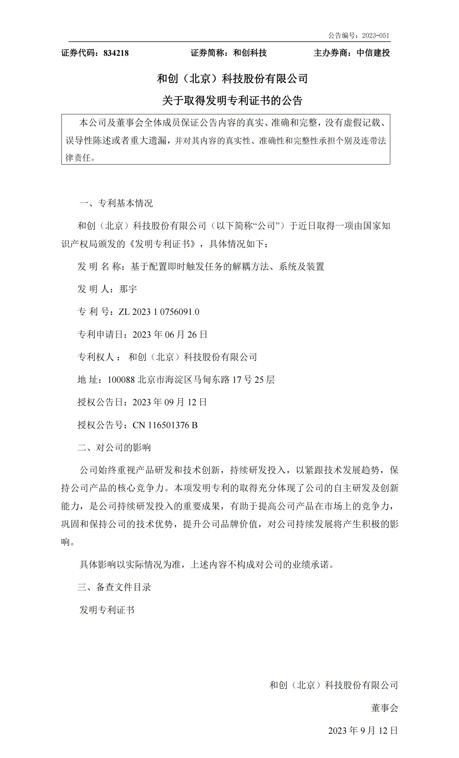 公司始終重視產(chǎn)品研發(fā)和技術(shù)創(chuàng)新,持續(xù)研發(fā)投入,以緊跟技術(shù)發(fā)展趨勢,保持公司產(chǎn)品的核心競爭力。這兩項發(fā)明專利的取得充分體現(xiàn)了公司的自主研發(fā)及創(chuàng)新能力,是公司持續(xù)研發(fā)投入的重要成果,有助于提高公司產(chǎn)品在市場上的競爭力,鞏固和保持公司的技術(shù)優(yōu)勢,提升公司品牌價值,對公司持續(xù)發(fā)展將產(chǎn)生積極的影響。