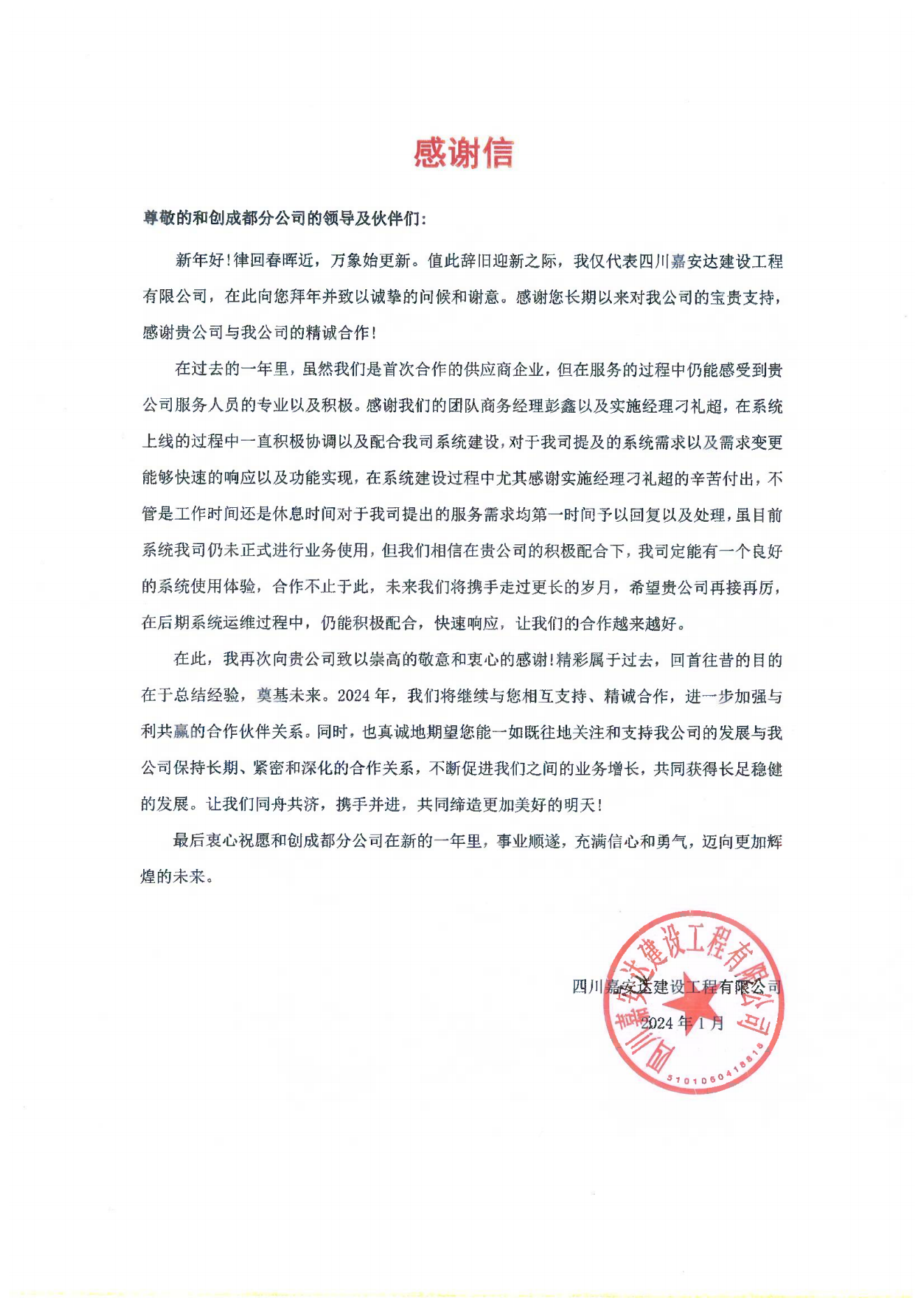 四川嘉安達(dá)建設(shè)工程有限公司向紅圈發(fā)來感謝信!客戶的認(rèn)可是我們最大的動力!
