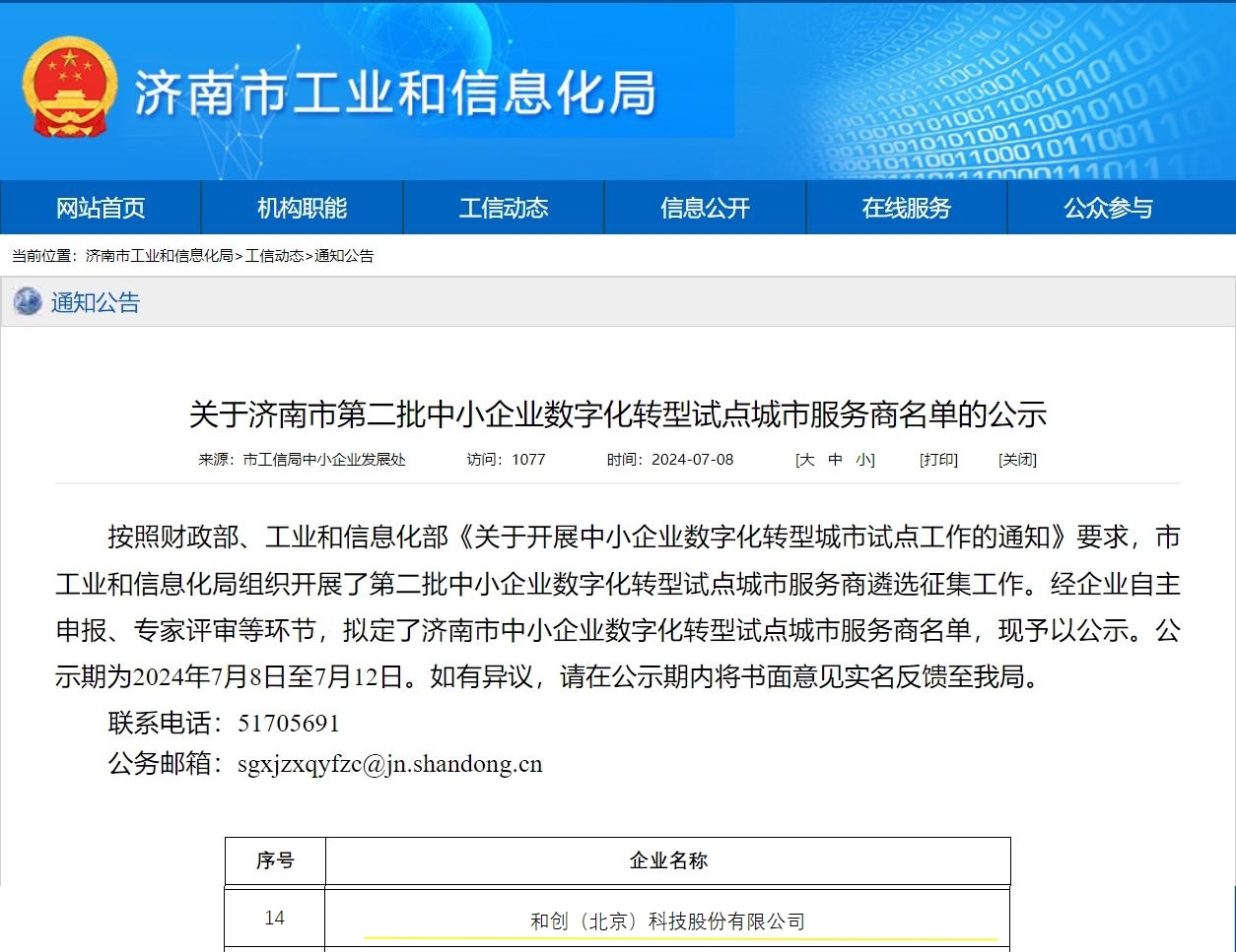 近日,濟南市工業和信息化局正式公布了濟南市第二批中小企業數字化轉型試點城市服務商名單,和創(北京)科技股份有限公司(以下簡稱“和創科技”)憑借其深厚的行業知識積累、卓越的SaaS系統實施能力以及完善的行業服務生態,成功入選該名單,標志著和創科技在數字化轉型領域的實力和成就得到了官方的高度認可。