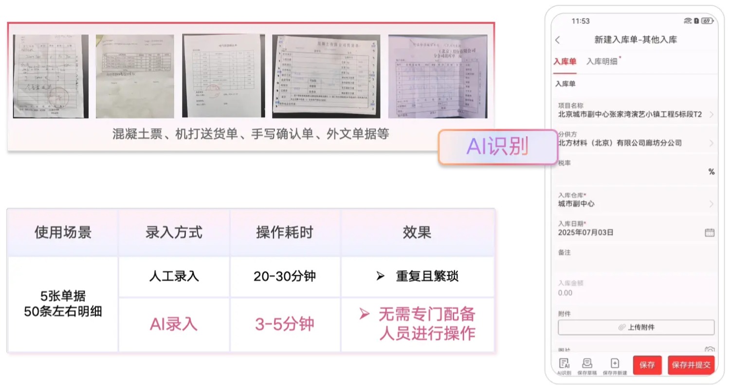 AI錄單助手能夠自動從入庫單中識別出材料的名稱、規(guī)格、數(shù)量等信息,并進行數(shù)據(jù)回填。系統(tǒng)還會在數(shù)據(jù)錄入時進行實時成本預(yù)警,確保企業(yè)在采購環(huán)節(jié)能夠精確把控成本。通過AI的輔助,入庫單的錄入時長縮短了80%,而成本控制的準(zhǔn)確性提高了20%,極大提高了企業(yè)的資金使用效率。
