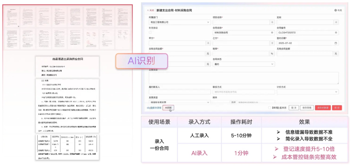 智能識別并錄入合約條款、付款比例、付款條件等關(guān)鍵信息,為成本控制提供更詳實依據(jù)。