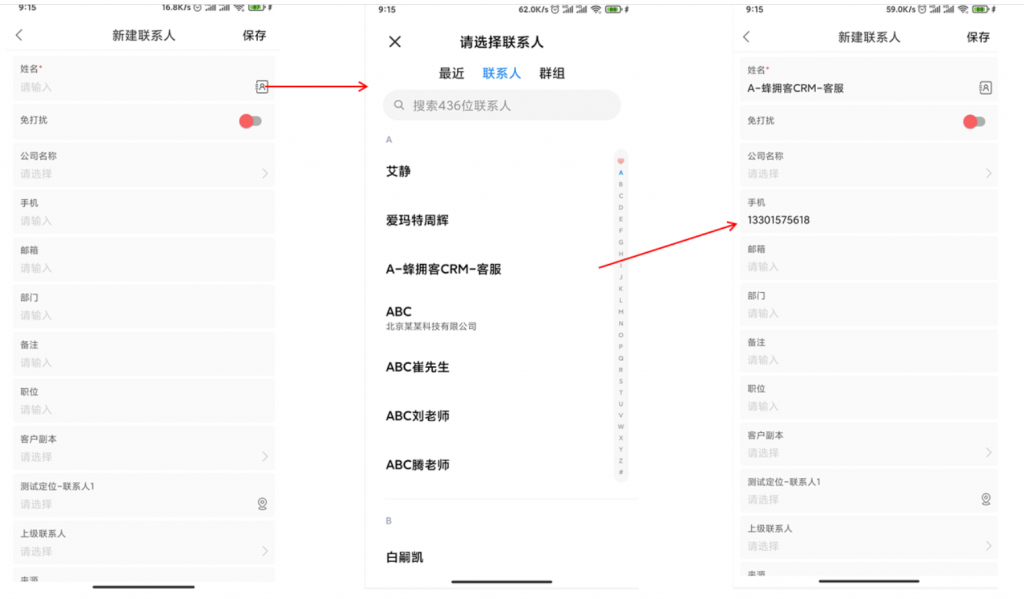 - 在手機端新建聯系人時可以在手機通訊錄里進行選擇,方便易用。