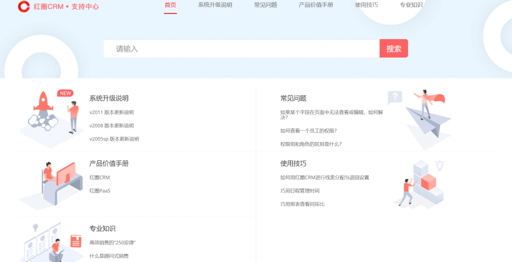 支持中心包含產(chǎn)品價(jià)值手冊(cè)、版本更新說明、常見問題、常用技巧和專業(yè)知識(shí)五部分,用戶可方便查找相關(guān)內(nèi)容。在前臺(tái)頁面右上角點(diǎn)擊“支持中心”可直接進(jìn)入支持中心。