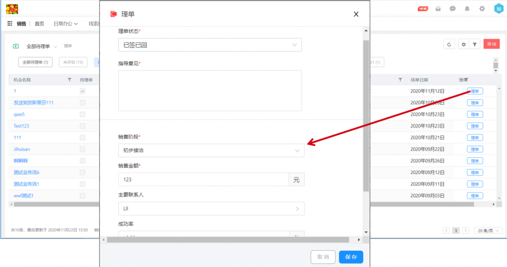 1) 理單頁面顯示及邏輯調(diào)整,單獨(dú)顯示待理單數(shù)據(jù)和按理單階段顯示全部銷售機(jī)會(huì),理單后數(shù)據(jù)直接顯示到指定的理單階段;