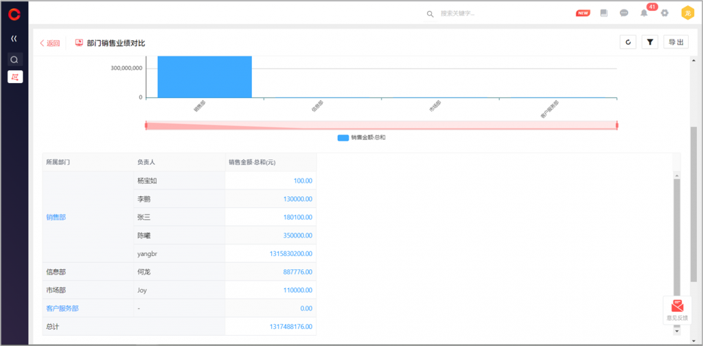 部門/人員鉆取分析:簡報組件可開啟“支持部門/人員下鉆分析”,開啟后,在簡報查看時,可點擊進(jìn)入分析報表,以數(shù)據(jù)負(fù)責(zé)人為依據(jù),按照部門/人員的逐級鉆取查看指標(biāo)在各部門及員工的分布情況