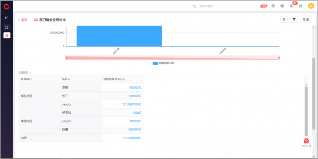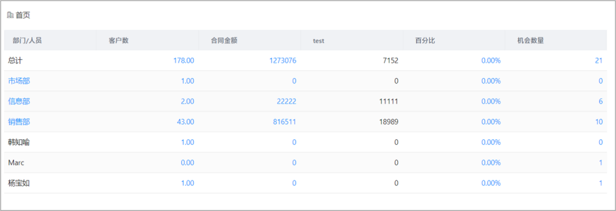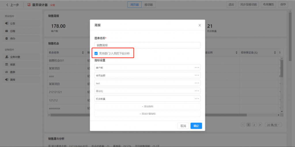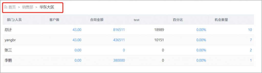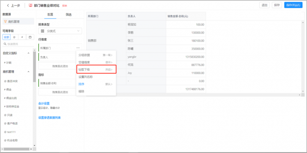 自定義報表支持部門下鉆:當(dāng)以部門為維度時,可開啟部門下鉆,逐級查看下級部門的分析數(shù)據(jù)