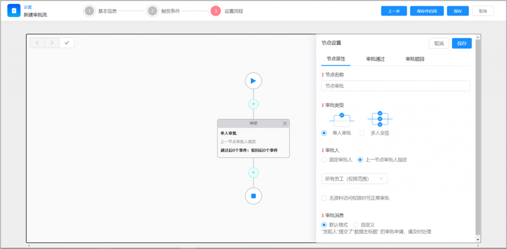 復(fù)制審批流時,支持將節(jié)點中的可復(fù)制信息帶入到新流程中,如節(jié)點名稱、類型、審批人、抄送人、意見和其他通用設(shè)置