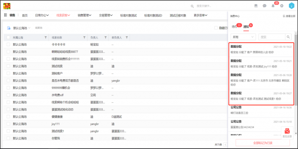 線索池、客戶池管理員分配數(shù)據(jù)后,系統(tǒng)會給新負(fù)責(zé)人發(fā)通知提醒