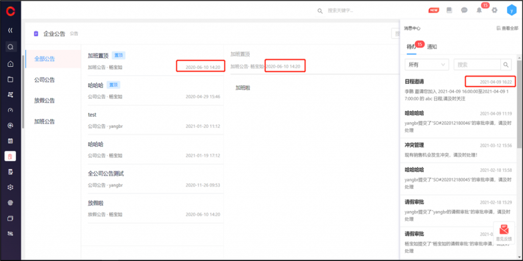 通知、待辦、公告、動態(tài)、審批流歷史中的時間顯示完整時間,如2021-05-21 10:11,時間留痕更嚴(yán)謹(jǐn)。