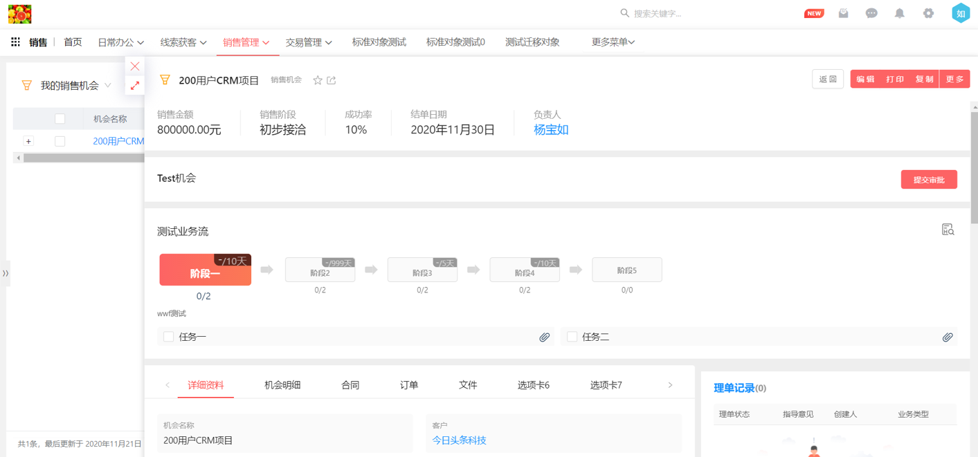 新的審批流中還增加了狀態顯示字段,并在頁面布局中增加了“審批歷史”組件,當在頁面布局中設置以后,可以在資料詳情頁直接查看審批歷史,審批狀態顯示更明了。
