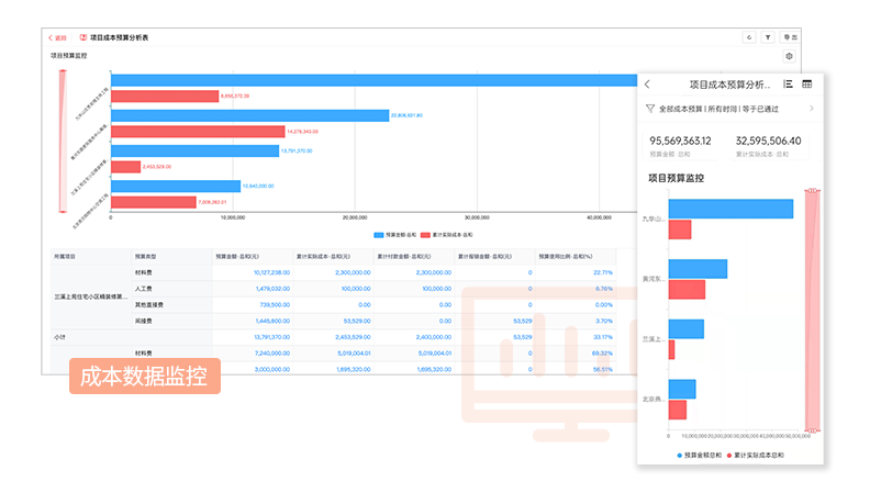 實時成本歸集,管理者可隨時掌握每一時點的收支、盈利狀況,即動態成本和動態利潤,并進行對比分析;成本數據可鉆取查詢,想看任何一項數據都可直接追本溯源;成本預控預警,各項成本在預算控制中,施工過程中材料使用超標或者少于標準用量,系統自動觸發提醒,施工進度百分比一目了然。