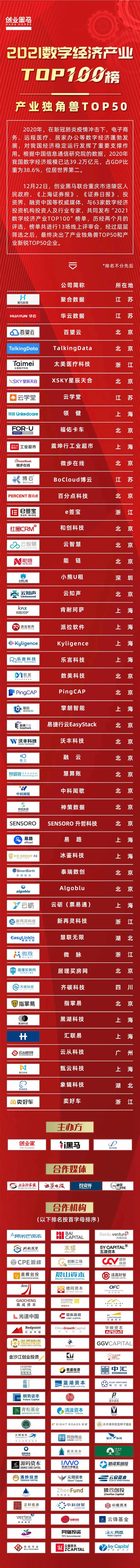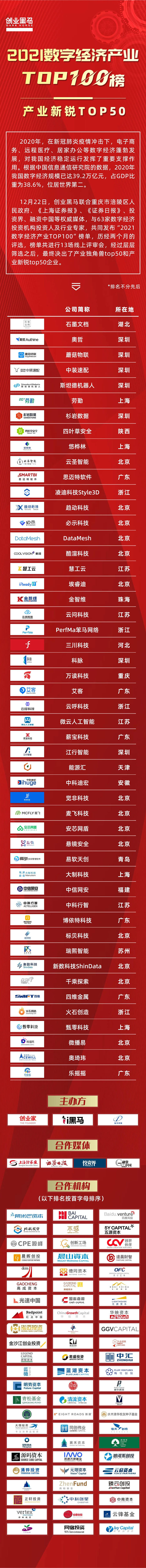 基于此,12月22日創(chuàng)業(yè)黑馬聯(lián)合重慶市涪陵區(qū)人民政府、《上海證券報》、《證券日報》、投資界、融資中國等權(quán)威媒體,與63家數(shù)字經(jīng)濟投資機構(gòu)投資人及行業(yè)專家,共同發(fā)布“2021數(shù)字經(jīng)濟產(chǎn)業(yè)TOP100”榜單。