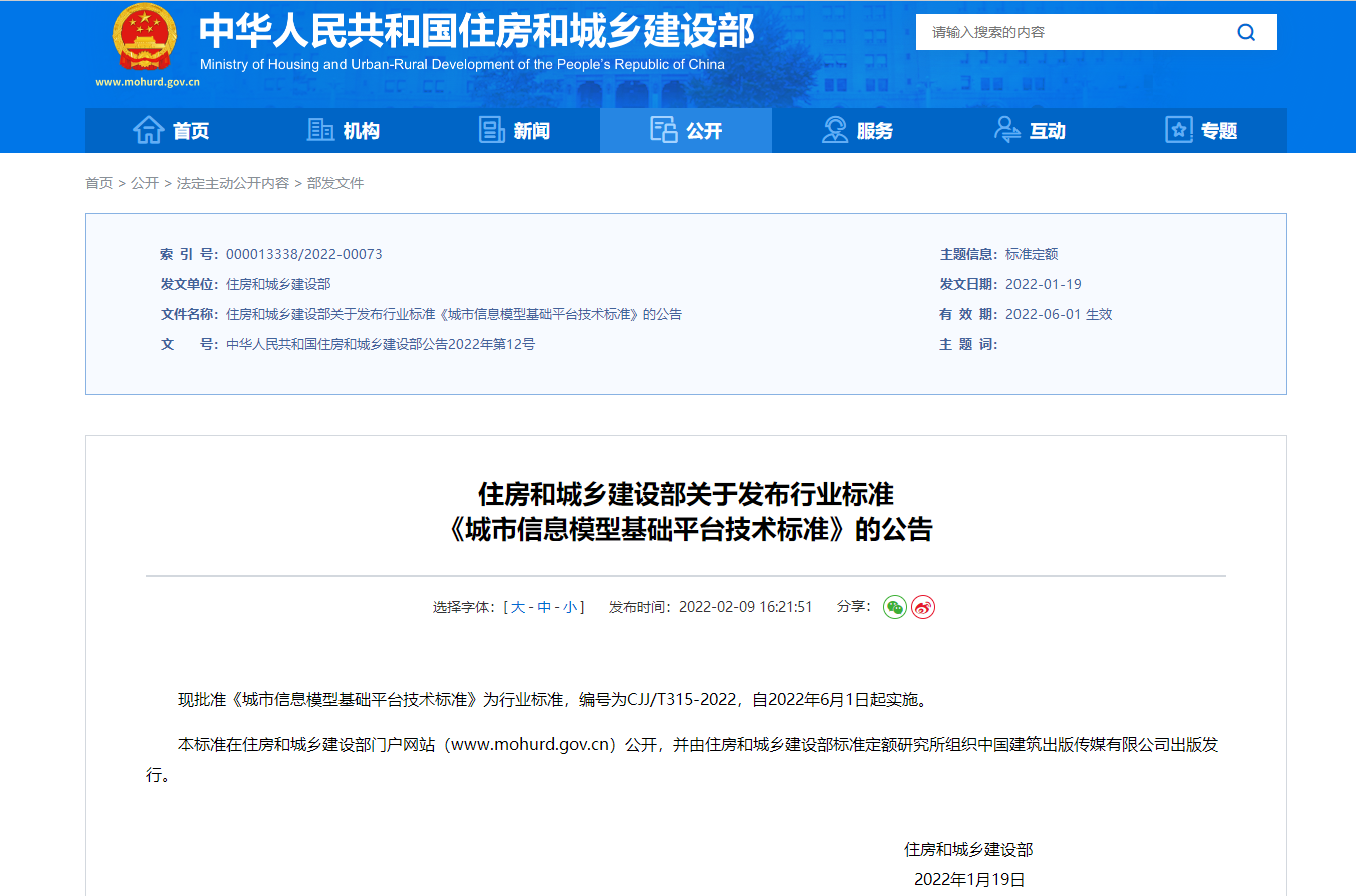 現批準《城市信息模型基礎平臺技術標準》為行業標準,編號為CJJ/T315-2022,自2022年6月1日起實施。