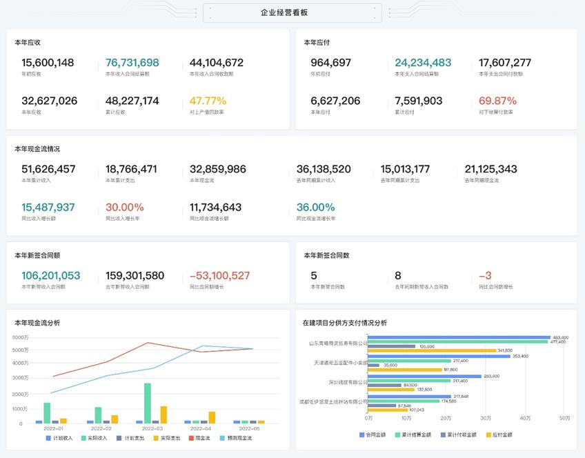 在數字換轉型的政策推動下,傳統工程企業也開啟了數字化轉型的發展新進程。在轉型初期,引進數字化管理工具能夠起到快速梳理和規范內部管理的作用,再配合平臺大數據的信息互通,老板通過一個軟件就能夠隨時掌控企業現金流盈虧數據,從而保證了企業現金流的良性周轉。