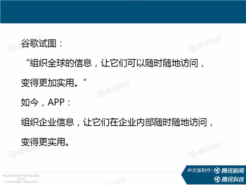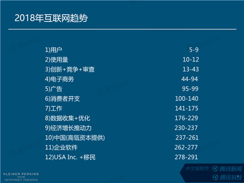 2018年互聯(lián)網(wǎng)趨勢(shì)報(bào)告正式發(fā)布,本次報(bào)告全面概括了2017年全球互聯(lián)網(wǎng)發(fā)展趨勢(shì),從用戶(hù)、電商、廣告、消費(fèi)支出、數(shù)據(jù)獲取和優(yōu)化、經(jīng)濟(jì)增長(zhǎng)驅(qū)動(dòng)力、中國(guó)市場(chǎng)、企業(yè)軟件等12個(gè)章節(jié)。