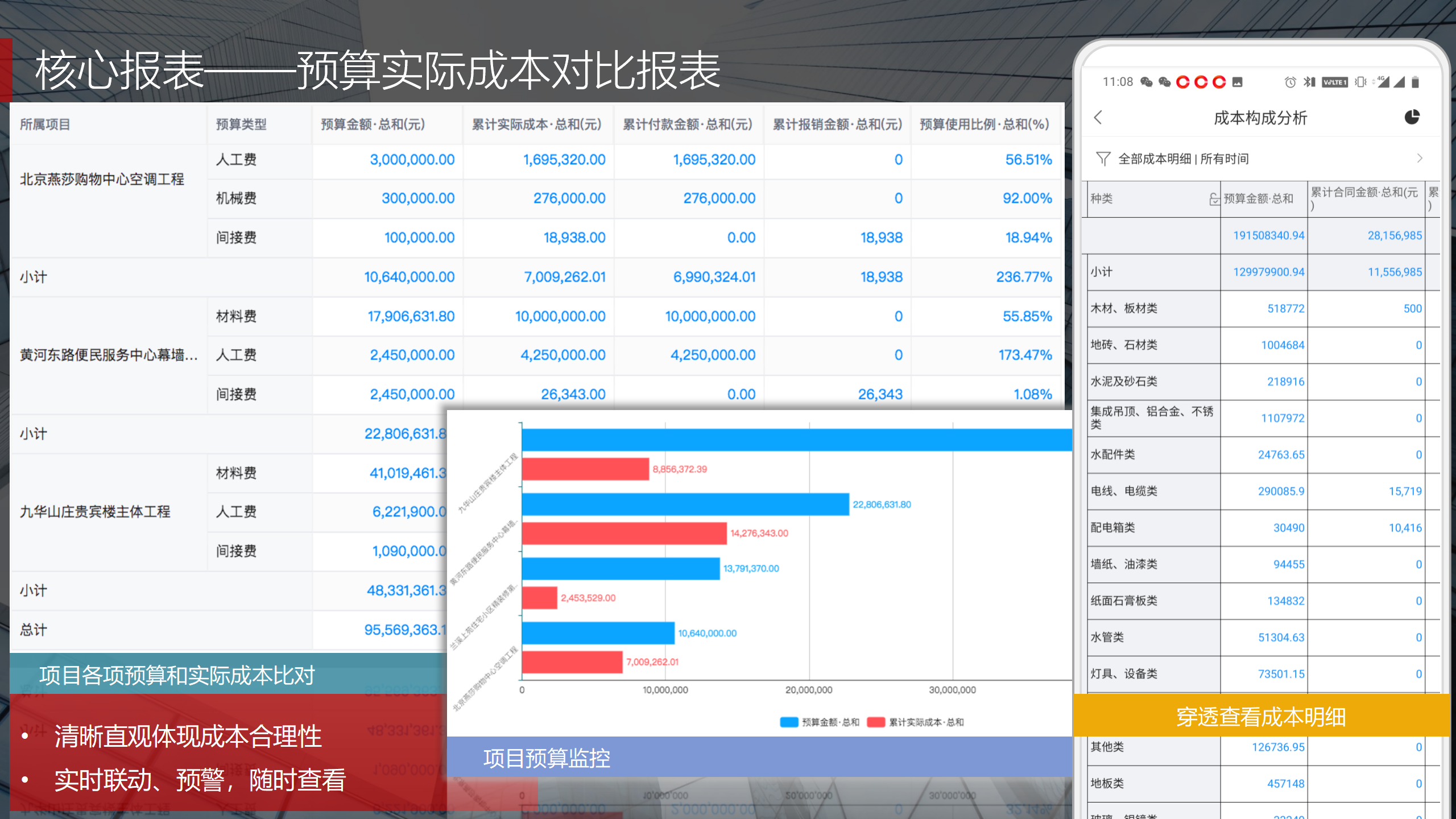 紅圈系統(tǒng)在PaaS平臺基礎(chǔ)上,根據(jù)工程項目管理的實際情況,通過人力資源管理、資金管理、成本管理、物資管理、安全質(zhì)量管理、招投標(biāo)管理、合同管理、勞務(wù)管理等功能模塊,利用報表引擎實時動態(tài)抓取項目管理過程中的相關(guān)數(shù)據(jù),實時動態(tài)展現(xiàn)公司整體項目運營情況。當(dāng)某項科目設(shè)定額度一旦超出計劃指標(biāo)時,系統(tǒng)會自動發(fā)送動態(tài)預(yù)警。為公司領(lǐng)導(dǎo)決策實時呈現(xiàn)動態(tài)智能數(shù)據(jù)分析,讓公司領(lǐng)導(dǎo)實時了解工程項目的整體運營效率及效益是否達(dá)標(biāo),經(jīng)營風(fēng)險是否可控,真正做到項目管理心中有“數(shù)”,滿足公司對信息化管理的需求,提升公司經(jīng)營管理能力,實現(xiàn)工程項目全過程管理的降本增效。
