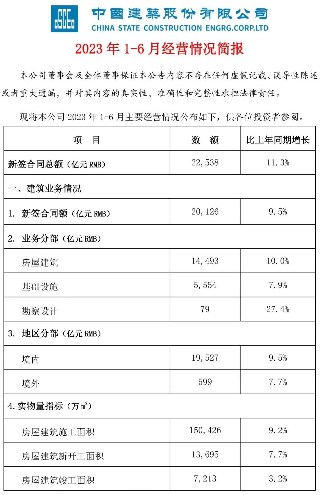 導讀:7月8日,中國建筑發(fā)布了《中國建筑2023年1-6月經營情況簡報》。根據公告顯示,中國建筑2023年前6個月累計實現新簽合同額22538億元,同比增長11.3%。