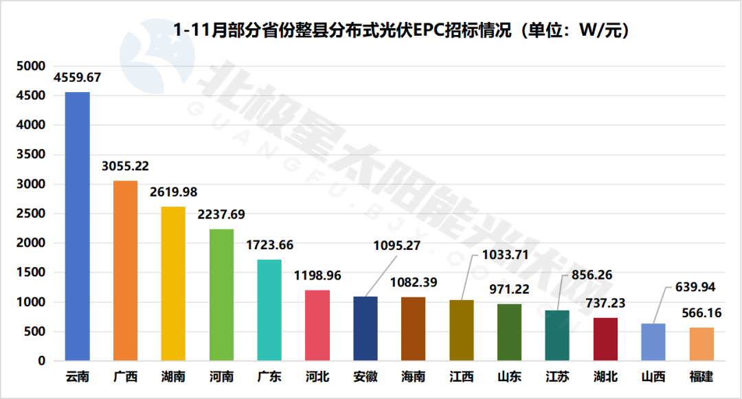 從區域分布來看,1-11月,國內光伏電站EPC招標項目主要分布在云南、廣西、湖南、河南、廣東等22個省份。