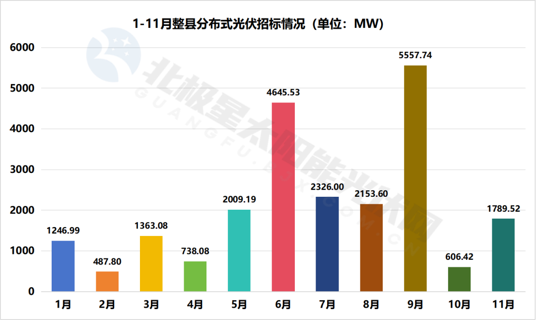 從時間分布的角度來看,除了2月、4月和10月之外,每個月的招標規模均達到了GW級別。其中,9月和6月的招標規模尤為突出,分別達到了5557.74MW和4645.53MW。
