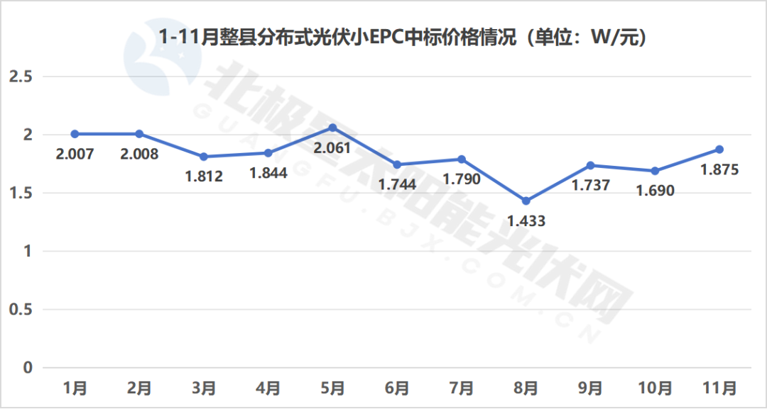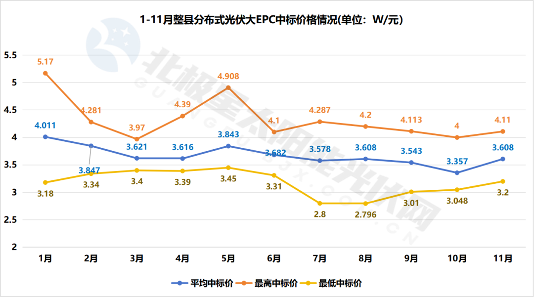 具體來看,1-11月大EPC項目的均價在逐漸下降,從年初的4.011元/W降至11月份的3.608元/W,其中,最高價格5.17元/W出現在1月,項目為國家能源集團鐵力整縣分布式光伏項目,最低價格2.796元/W在8月,項目為貴州華電畢節威寧縣整縣一期1.818MWp分布式光伏發電項目。