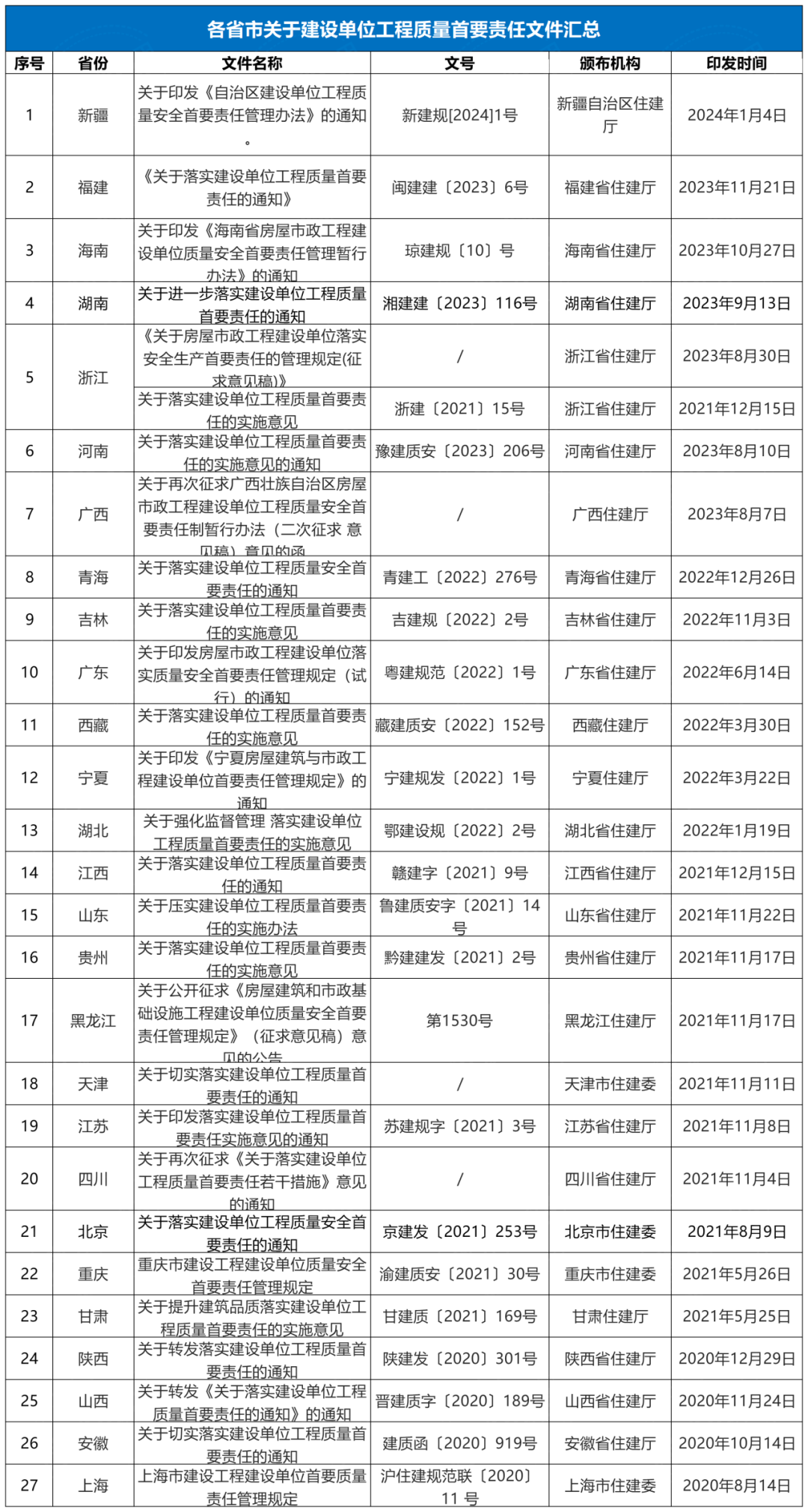 截至目前,27省市已經(jīng)發(fā)文跟進住建部《關于落實建設單位工程質(zhì)量首要責任的通知》(建質(zhì)規(guī)〔2020〕9號),嚴格落實建設單位工程質(zhì)量首要責任。