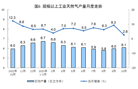 天然氣生產保持平穩,進口增速加快。10月份,生產天然氣190億立方米,同比增長2.6%,增速比9月份回落6.7個百分點,日均產量6.1億立方米。進口天然氣879萬噸,同比增長15.5%,增速比9月份加快15.1個百分點。