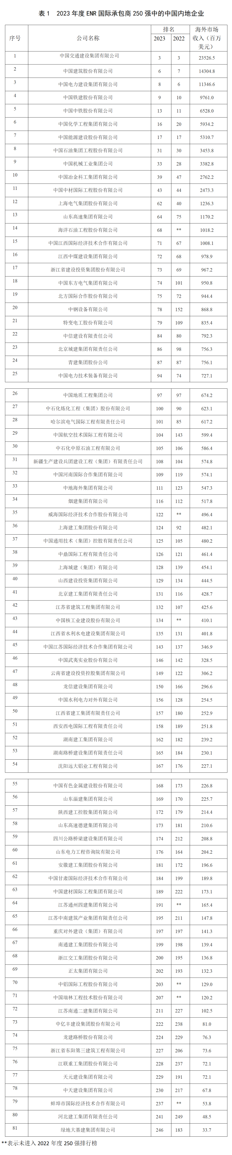 美國《工程新聞記錄》(簡稱“ENR”)雜志公布的2023年度全球最大250家國際承包商共實現(xiàn)海外市場營業(yè)收入4285.0億美元,較上年度增長7.7%,是近 10 年來罕見的增長速度。我國內(nèi)地共有81家企業(yè)入選2023年度國際承包商250強榜單,入選數(shù)量比上一年度增加了2家。入選企業(yè)共實現(xiàn)海外市場營業(yè)收入1179.3億美元,收入合計占國際承包商250強海外市場營收總額的27.5%。