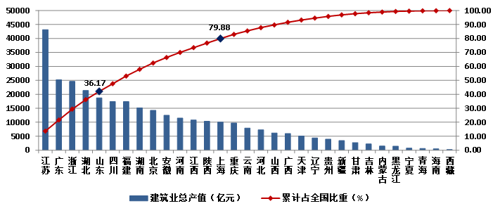 2023年,江蘇建筑業(yè)總產(chǎn)值達到43140.15億元,以絕對優(yōu)勢繼續(xù)領跑全國。廣東、浙江、湖北三省的建筑業(yè)總產(chǎn)值也都超過了2萬億元,分列第二、三、四位。4省建筑業(yè)總產(chǎn)值共占全國建筑業(yè)總產(chǎn)值的36.17%。除這4省外,總產(chǎn)值超過1萬億元的還有山東、四川、福建、湖南、北京、安徽、河南、江西、陜西、上海10個省市,上述14個地區(qū)完成的建筑業(yè)總產(chǎn)值占全國建筑業(yè)總產(chǎn)值的79.88%(圖15)。