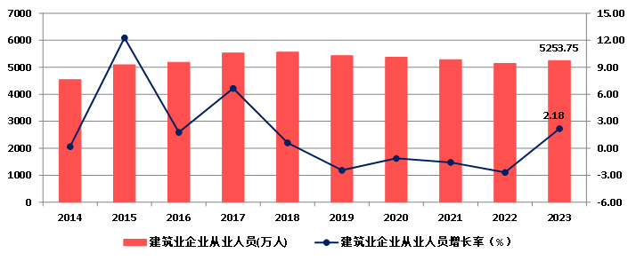 2023年,建筑業(yè)從業(yè)人數(shù)5253.75萬人,比上年末增加112.15萬人,增長2.18%,結(jié)束了連續(xù)三年減少的態(tài)勢(圖6)。