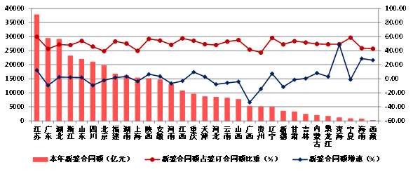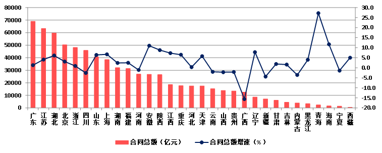 圖20 2023年各地區(qū)建筑業(yè)企業(yè)新簽合同額及增速