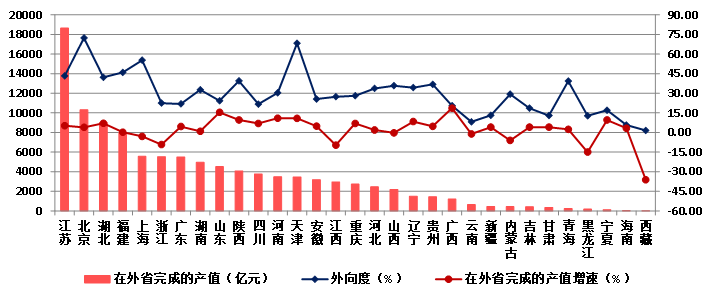 圖18 2023年各地區(qū)跨省完成的建筑業(yè)總產(chǎn)值及外向度