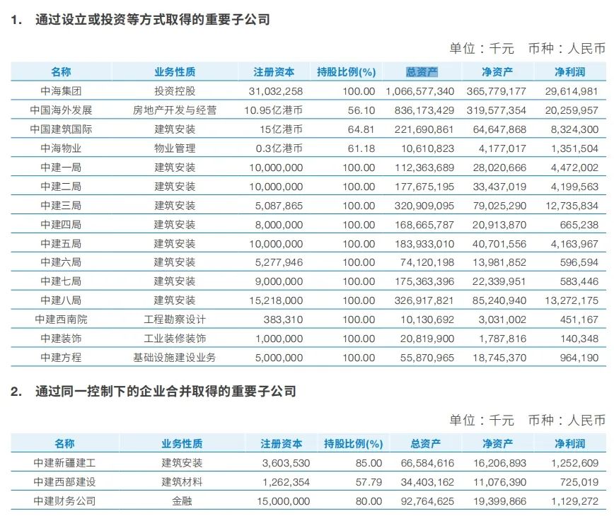 2023年度報告中,中國建筑公布重要子公司的總資產、凈資產和凈利潤等數據,具體如下: