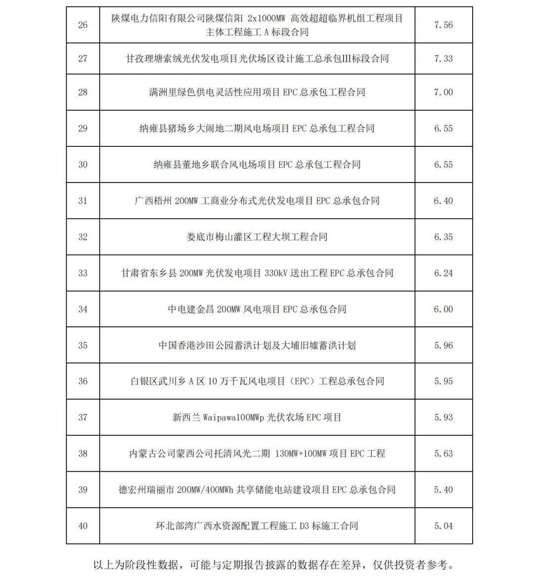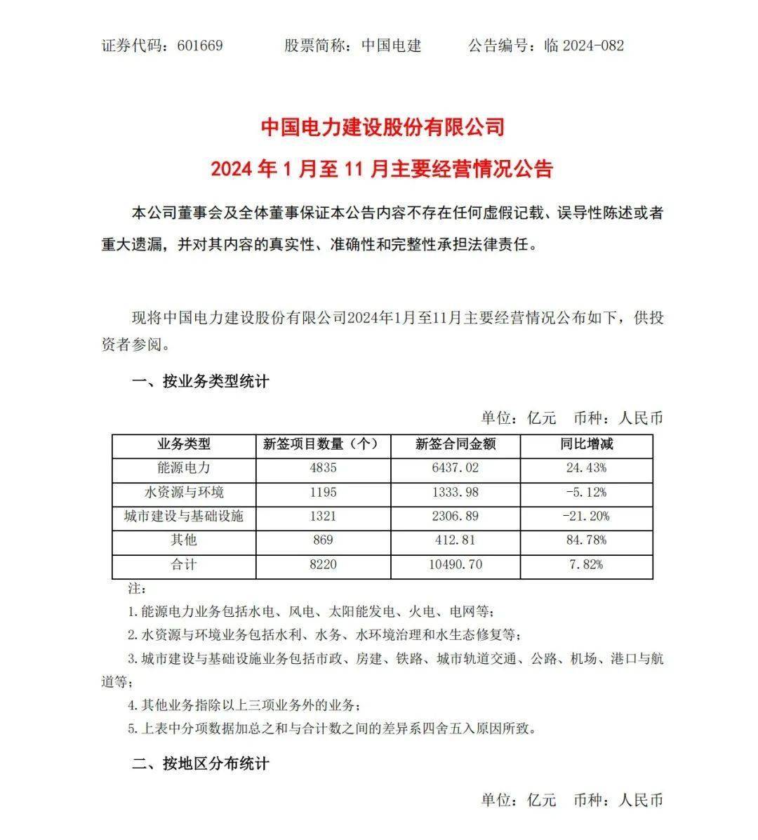 12月20日,中國電建發布《 中國電力建設股份有限公司2024年1月至11月主要經營情況公告》,披露了2024年1-11月,2024年11月,公司新簽合同金額在人民幣5億元以上的單體項目共有40個。