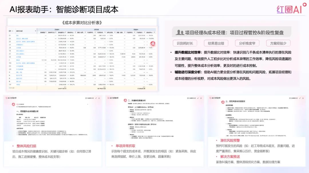 紅圈AI正在成為工程企業快速完成智能化躍遷的重要工具。它通過整合經營數據、自動化風險識別、智能知識檢索,幫助企業以更低的成本、更高的效率滿足政策要求,并從中獲得管理透明化和決策科學化的收益。