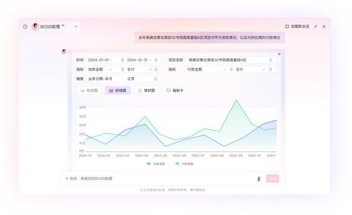 在具體應(yīng)用中,BOSS助理可快速鎖定數(shù)據(jù),例如查詢“張偉昨天提交的審批”,AI通過意圖識別下發(fā)指令,系統(tǒng)在判斷權(quán)限后返回列表,精準調(diào)取對應(yīng)審批,實現(xiàn)急事優(yōu)先快速處理。此外,它還能響應(yīng)諸如“查看高碑店項目各供應(yīng)商支付情況”的復雜查詢,直接呈現(xiàn)合同金額、結(jié)算金額、支付金額等關(guān)鍵指標,幫助管理者快速發(fā)現(xiàn)異常并追溯源頭。
