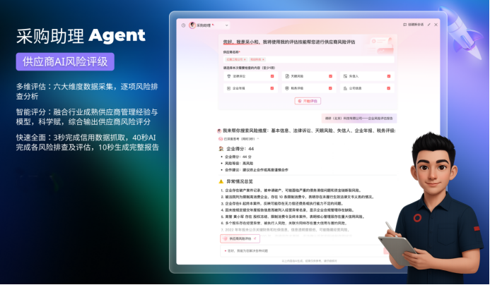 采購助理具備多維評估、智能評分和快速全面三大特點。它基于六大維度數(shù)據(jù)采集——包括企業(yè)基礎(chǔ)信息、年報、法律訴訟、失信人、天眼風險、納稅評級,逐項風險排查分析,融合行業(yè)成熟供應(yīng)商管理經(jīng)驗與模型,科學賦分,綜合輸出供應(yīng)商風險評分。整個過程極速高效:3秒完成信用數(shù)據(jù)抓取,40秒AI完成各風險排查及評估,10秒生成完整報告。
