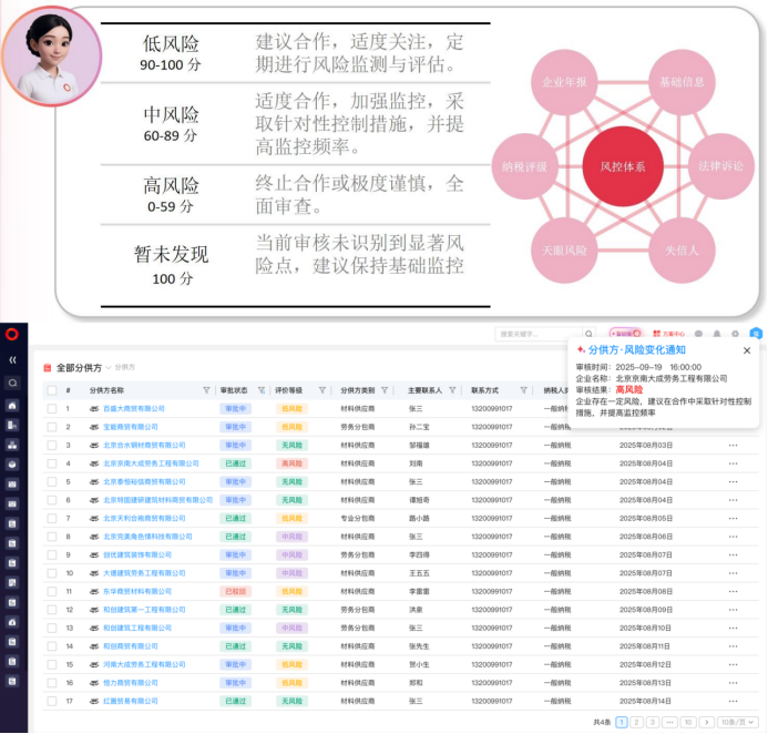 采購助理還支持定期智能排查,自動刷新已合作供應(yīng)商風險等級,針對高風險供應(yīng)商及時預(yù)警,并可設(shè)置限制合作標準,快速終止合作并系統(tǒng)溯源追查。通過構(gòu)建涵蓋組織架構(gòu)、企業(yè)年報、納稅評級、法律訴訟、天眼風險、失信人等維度的風險矩陣,采購助理為企業(yè)建立起科學、透明、高效的供應(yīng)商管理體系。