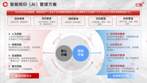 在企業(yè)的運(yùn)營(yíng)脈絡(luò)中,印章雖小,卻承載著沉重的法律責(zé)任與經(jīng)濟(jì)風(fēng)險(xiǎn)。面對(duì)合同協(xié)議繁多、應(yīng)用場(chǎng)景復(fù)雜的業(yè)務(wù)環(huán)境,特別是對(duì)于建筑工程類企業(yè)而言,依賴人工管理的傳統(tǒng)用印模式已顯疲態(tài),在風(fēng)險(xiǎn)控制與運(yùn)營(yíng)效率方面捉襟見肘。基于對(duì)建筑行業(yè)數(shù)字化進(jìn)程的深刻洞察,紅圈軟件推出了「智能AI印控一體化解決方案」,旨在以科技創(chuàng)新驅(qū)動(dòng)管理變革,引領(lǐng)企業(yè)實(shí)現(xiàn)用印流程全面、徹底的數(shù)字化與智能化轉(zhuǎn)型。