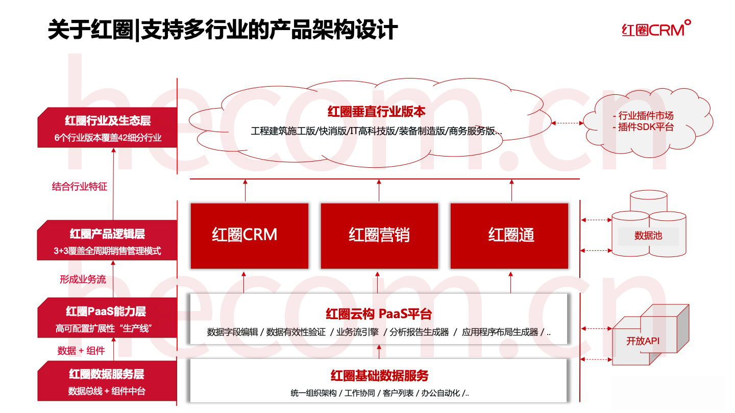 紅圈通過自有 PaaS 平臺真正實現了垂直化量身定制和深耕行業細分,實現了為企業CIO的營銷賦能。