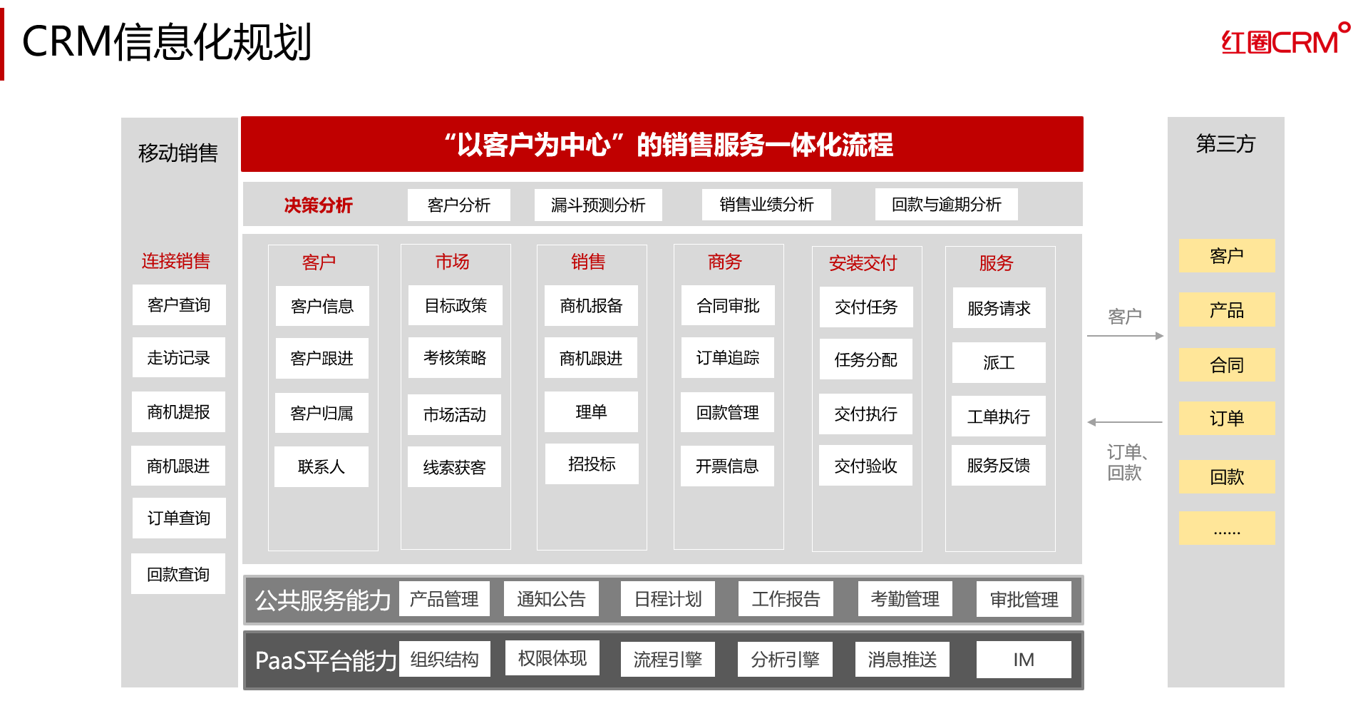 售后服務(wù)等業(yè)務(wù)環(huán)節(jié)都可能會(huì)有產(chǎn)品設(shè)計(jì)與工藝方案的調(diào)整,企業(yè)的業(yè)務(wù)模式具有明顯的多元化、個(gè)性化和碎片化特征,制造業(yè)企業(yè)必然面臨商業(yè)模式和管理模式雙重挑戰(zhàn)。為打通與改善企業(yè)從市場(chǎng)營(yíng)銷、銷售、研發(fā)、采購(gòu)、制造到客戶服務(wù)等核心業(yè)務(wù)環(huán)節(jié),借助紅圈CRM打造統(tǒng)一客戶交互平臺(tái),提升管理質(zhì)效,為客戶創(chuàng)造更大的價(jià)值。